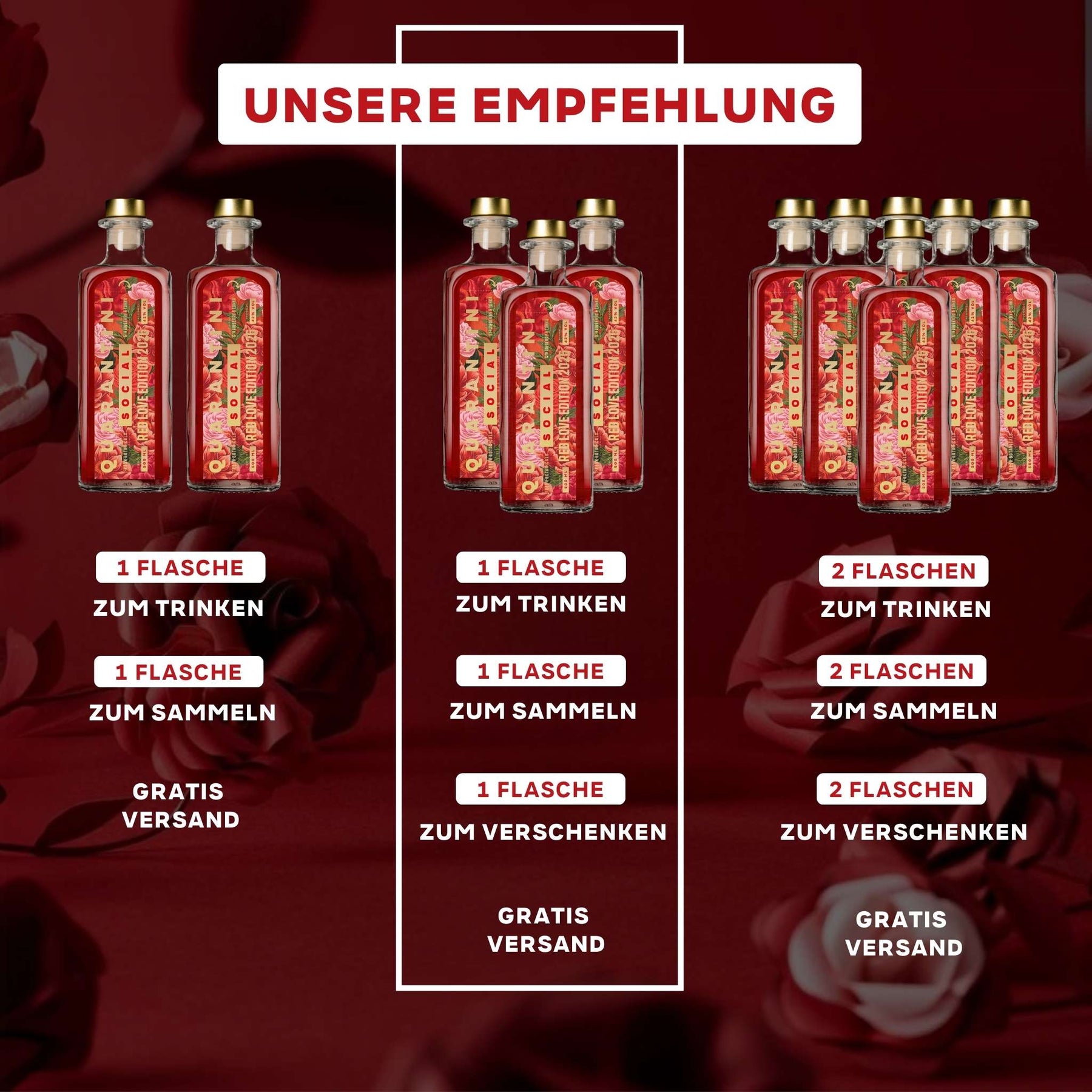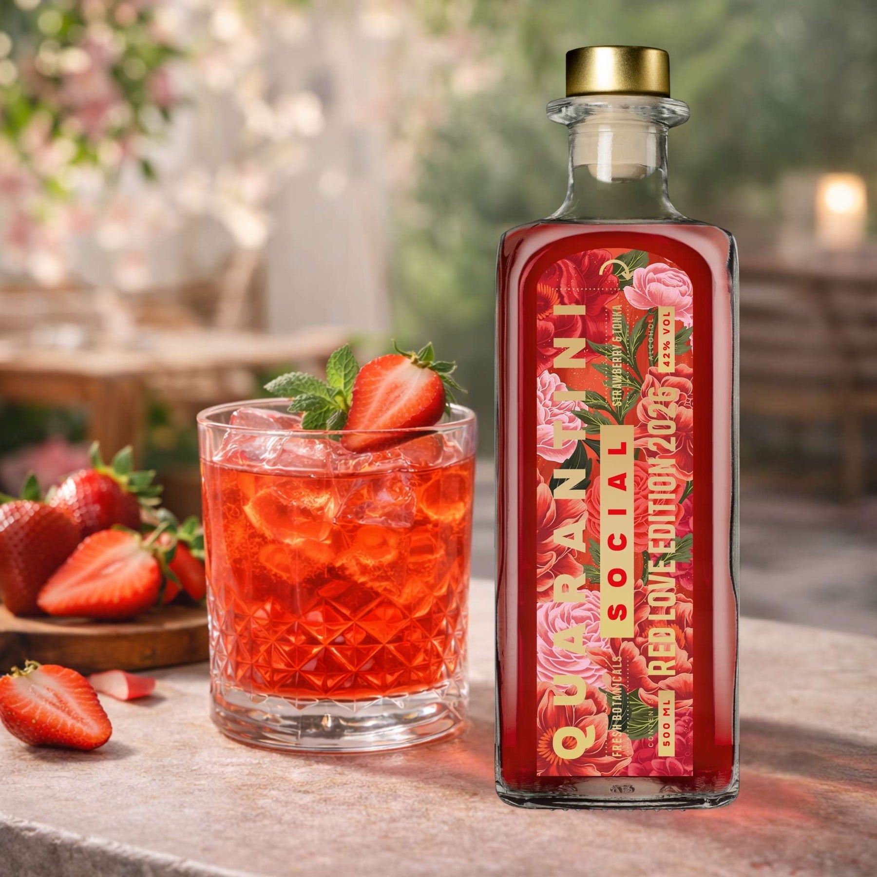 Fülle ein Tumblerglas mit Eiswürfeln und gieße 150 ml Tonic Water hinein. Anschließend vorsichtig 50 ml Red Love Edition 2026 über das Tonic Water geben, sodass ein Float-Effekt entsteht. Garniere mit einer Erdbeere und rühre leicht um.